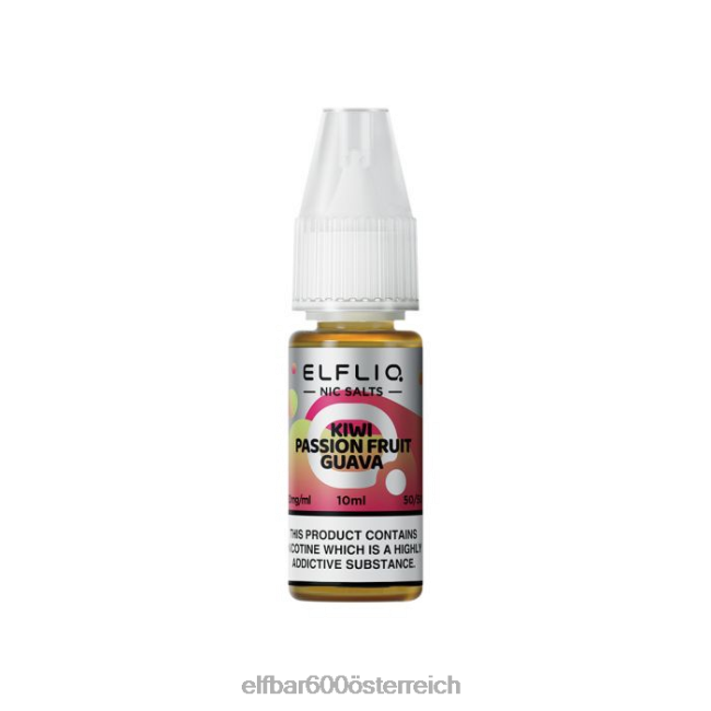 das Elfliq Kiwi Passion Fruit Guave 10 ml Nic Salt E-Liquid ist eine der neuen Geschmacksrichtungen in der Elfbar 10 ml E-Liquid-Kollektion, wie sie in zu finden ist Die Elfbar-Einwegartikel. in 10 mg oder 20 mg Nic-Salzen.